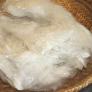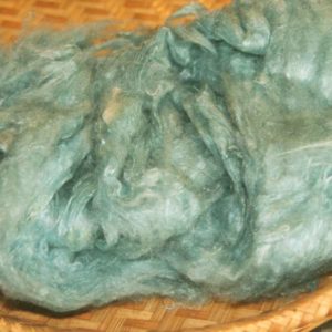 Combed top with a very minor amount of veg. The colour is ivory-white, liberally sprinkled with pure-white hairs and the odd light-brown as well. This is Welsh Mountain, a lofty fibre that makes terrific tweed fabrics, blankets and rugged outerwear.